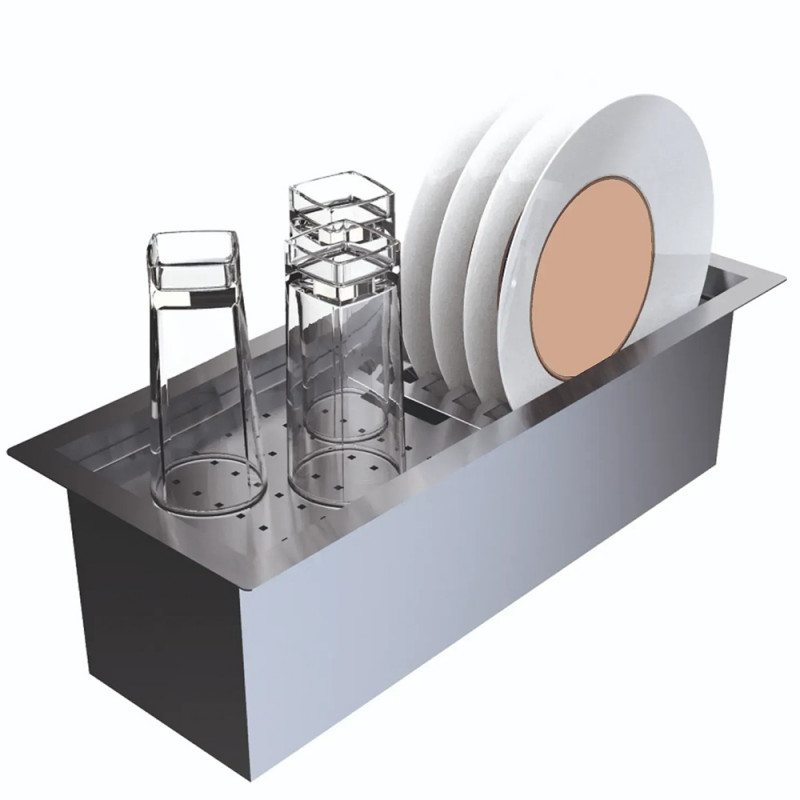 Вбудована сушарка-органайзер для посуду Fabiano FIDO 43 Inox — компактне рішення для сучасної кухні, що забезпечує порядок і чистоту навколо мийки. Виготовлена вручну з харчової нержавіючої сталі AISI304 товщиною 1,2 мм, вона гарантує стійкість до корозії та довговічність. Сушарка ідеально інтегрується в кухонні системи завдяки монтажу над або під стільницею. Її мінімалістичний дизайн із полірованою поверхнею гармонійно вписується в будь-який інтер’єр, а продумана конструкція забезпечує зручність і швидке висихання посуду.